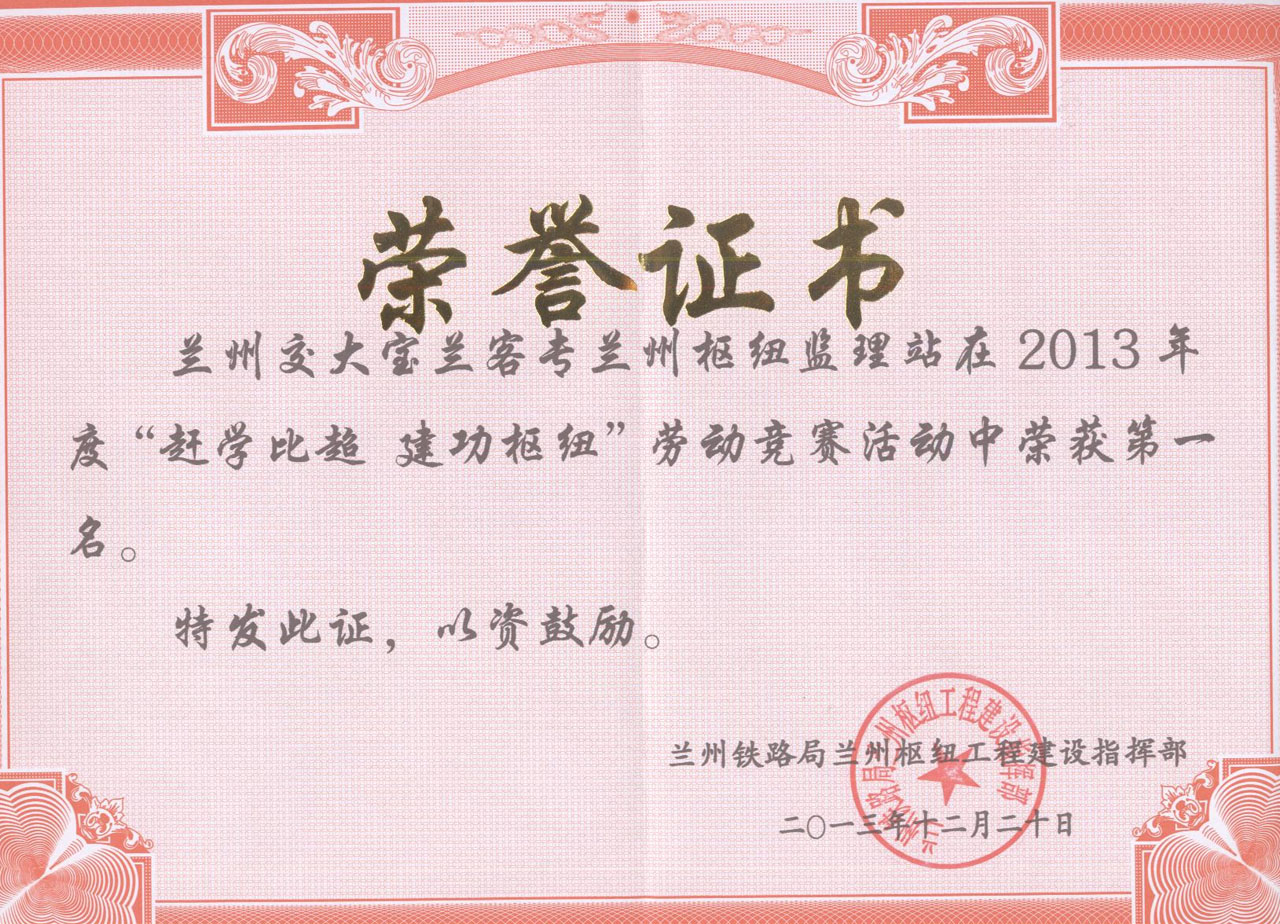 在蘭州鐵路局蘭州樞紐工程建設指揮部組織的“趕學比超、建功樞紐”勞動競賽活動中,我公司蘭州樞紐監理站高度重視,發揮理論與實際相結合的優勢,認真制定活動計劃,積極組織并貫徹落實。在“趕、學、比、超”活動中,蘭州樞紐監理站工作人員在施工現場積極主動工作,主動優化設計并得到設計單位和建設單位的認可,且得到建設單位蘭州局范圍內傳真電報通報表揚。對發現的質量問題及時制定解決辦法,進行盯控整改。對每月工程進度進行系統分析并形成書面材料,用以指導工期控制,充分發揮了監理單位的延伸作用,得到蘭州樞紐工程建設指揮部的一致肯定,在參與本次勞動競賽活動的八家監理單位中脫穎而出,榮獲2013年度“趕學比超,建功樞紐”勞動競賽活動第一名,并獲得榮譽證書及獎金伍萬元的獎勵。