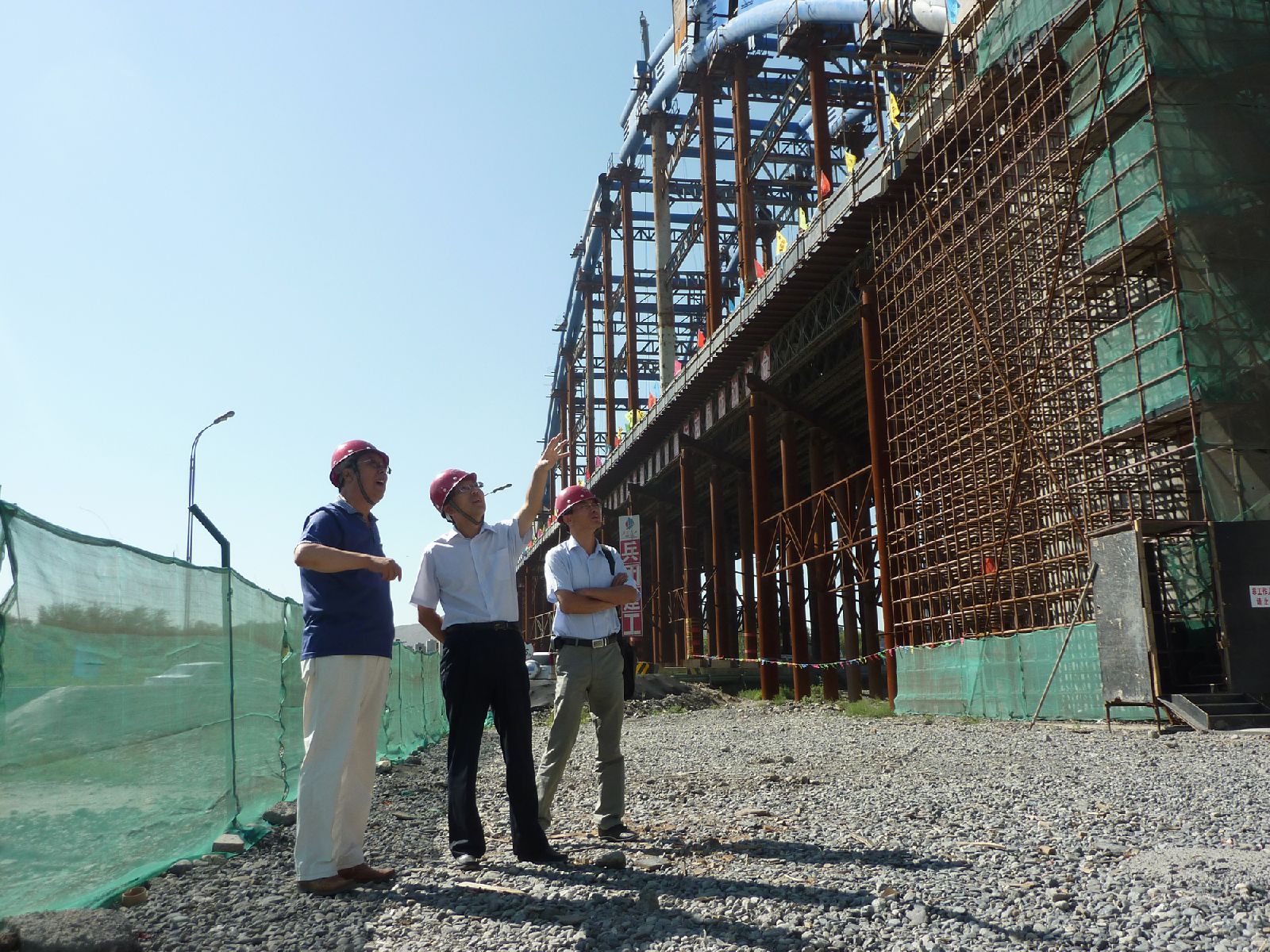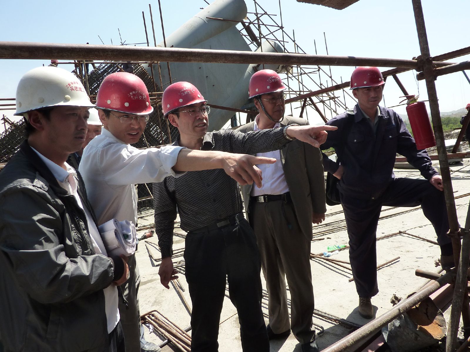 總監楊長安(左一)陪同蘭州交大校長揚子江(左二)視察烏魯木齊河特大橋施工現場