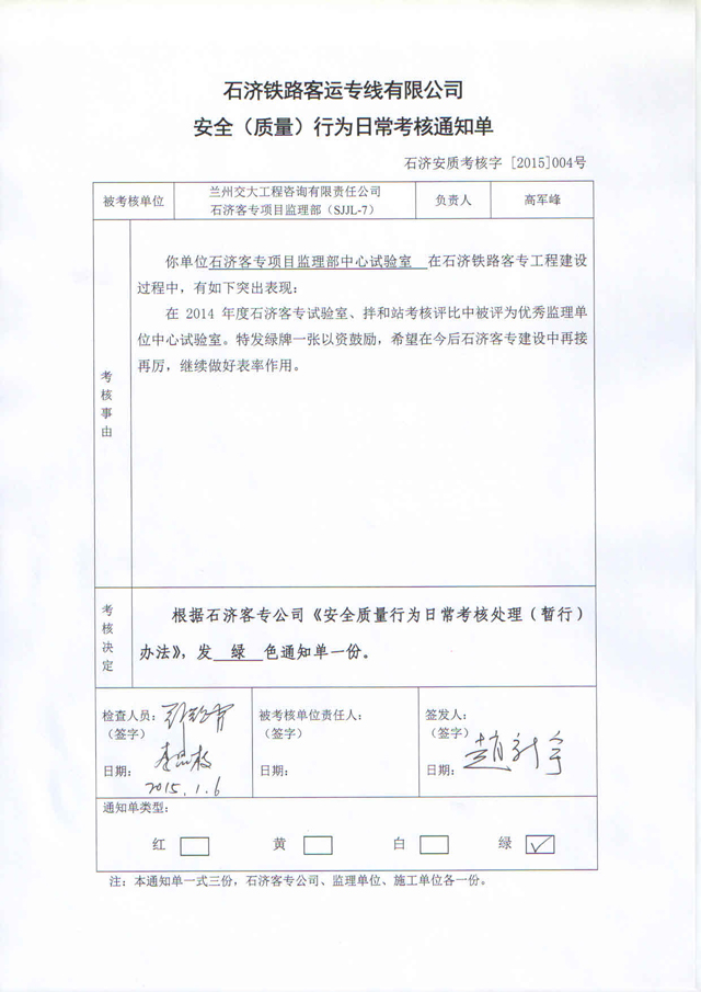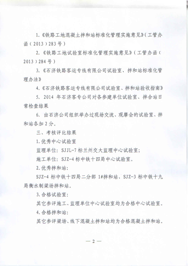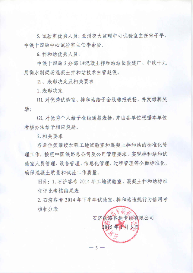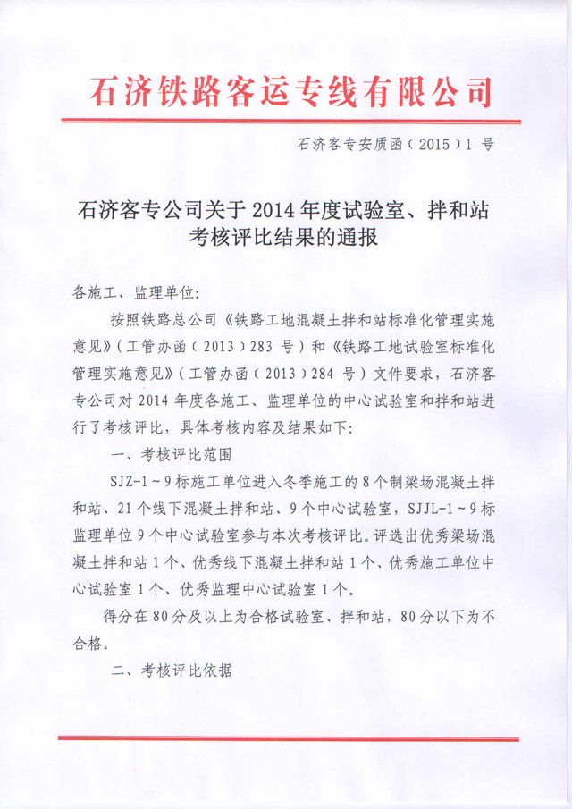 1月6日,石濟客專公司下發(fā)【2015】1號關(guān)于2014年度試驗室、拌合站考核評比結(jié)果通報,我公司石濟客專監(jiān)理站中心試驗室被評為2014年度優(yōu)秀中心試驗室,中心試驗室主任宋子平被評為2014年度試驗室優(yōu)秀人員,并頒發(fā)綠牌一張。