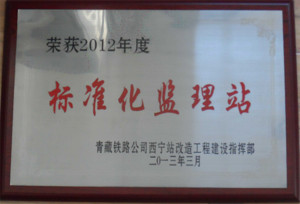 我公司西寧樞紐監理站繼2012年、2013年,在2014年監理工作中繼續團結奮進,攻堅克難,拼搏奉獻,實現了西寧火車站高速場和普速場的順利開通,為西寧站改及相關工程建設做出了積極貢獻。經西寧站改指揮部決定,授予我西寧樞紐監理站“2014年度標準化監理站”稱號,獎勵5萬元,我西寧樞紐監理站是西寧站改及相關工程參建單位中唯一一家連續三年榮獲“標準化監理站”稱號的監理單位。
