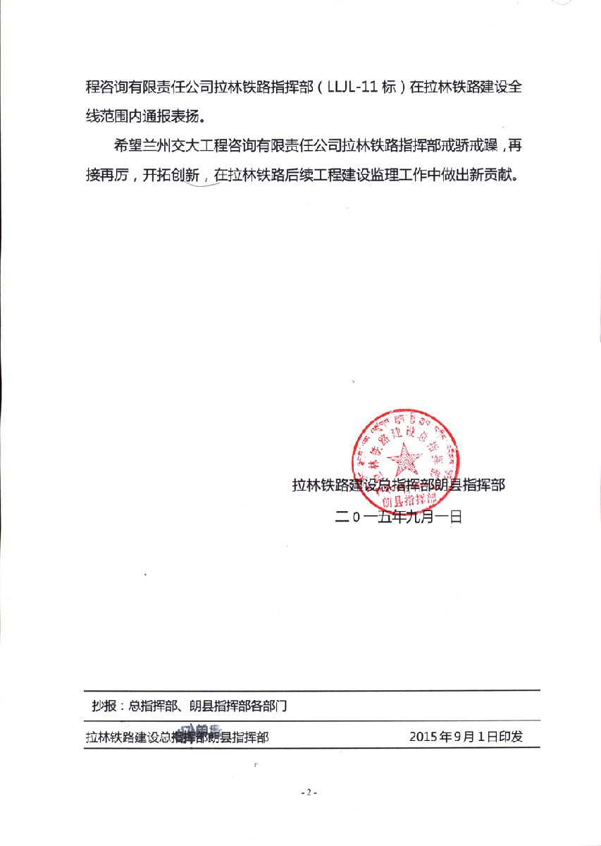 我公司拉林鐵路監(jiān)理站受到拉林鐵路建設(shè)總指揮部通報(bào)表揚(yáng)