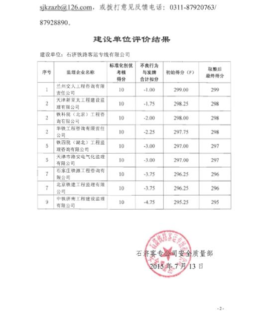 我石濟(jì)客專監(jiān)理站獲石濟(jì)公司2015年上半年監(jiān)理企業(yè)信用評(píng)價(jià)第一名
