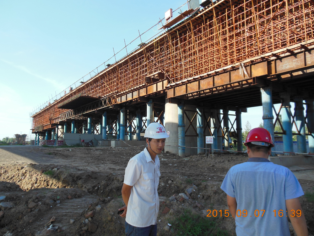 禹齊特大橋跨316省道(32+48+32)M現澆連續梁,長113.1M,寬12.2M,梁體截面類型為單箱單室,現澆連續梁支架分別采用鋼管柱支架和滿堂支架。為了確保連續梁體成功澆筑,監理站同項目部制定了切實可行的方案,積極組織人員機械設備,嚴格按照標準化配備進行施工。總監高軍鋒親臨現場對技術、安全、質量進行檢查監督指導,現場監理嚴格執行專項施工方案,并要求施工單位實施領導帶班制度,確保了連續梁施工規范有序,順利完成一次性澆筑。