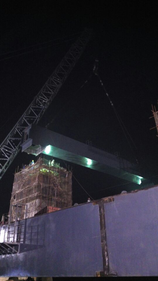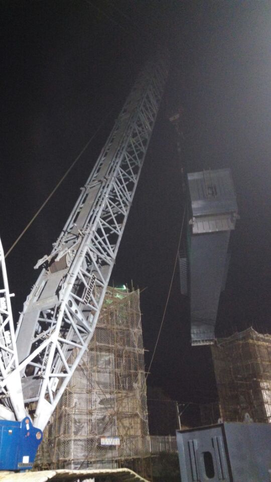 該橋技術含量高,施工難度大。且工期緊、任務重。監理站高度重視該橋施工安全質量,派駐經驗豐富監理人員駐場監造,確保出場鋼梁各項檢驗指標滿足設計要求。同時成立鋼梁吊裝現場監理組,全面負責吊裝現場的安全質量監控工作。并于12月14日凌晨1:37分順利完成首榀(21#)鋼梁吊裝就位工作,比計劃吊裝日期提前9天完成,得到了武廣公司大冶指揮部的通報表揚。