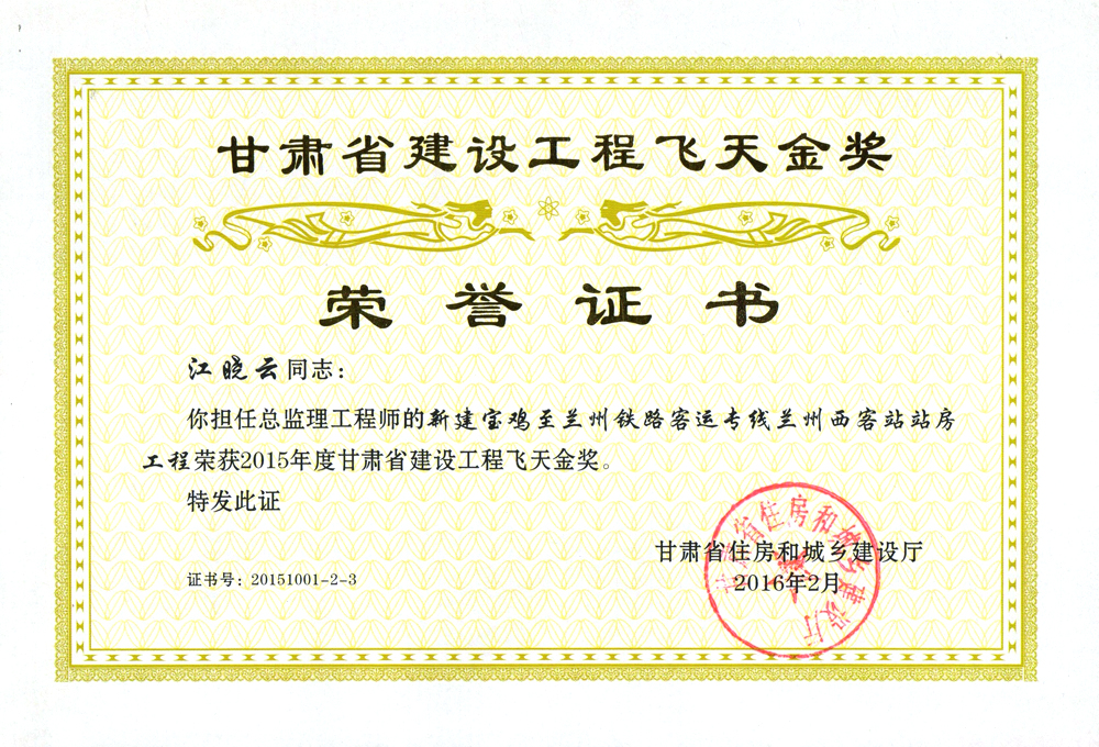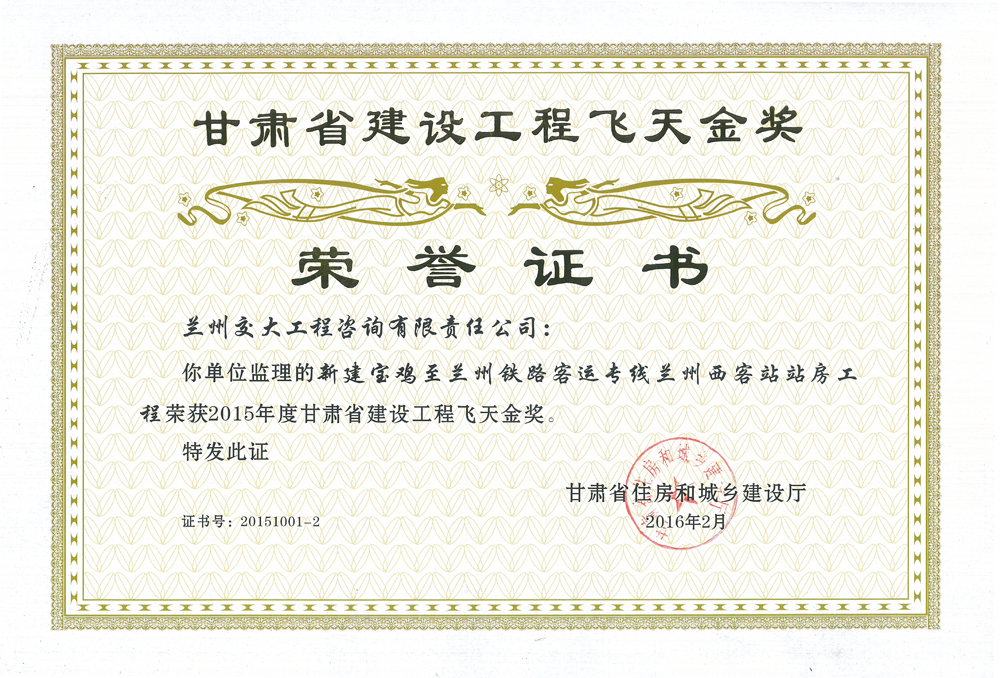 近日,2015年度甘肅省建設工程“飛天金獎”及“飛天獎”榜單揭曉,我公司負責監理的“新建寶雞至蘭州鐵路客運專線蘭州西客站站房工程”榮獲2015年度甘肅省建設工程“飛天金獎”。甘肅省建設工程“飛天獎”是全省建設工程質量最高水平的榮譽獎,“飛天金獎”更是其最高榮譽獎。