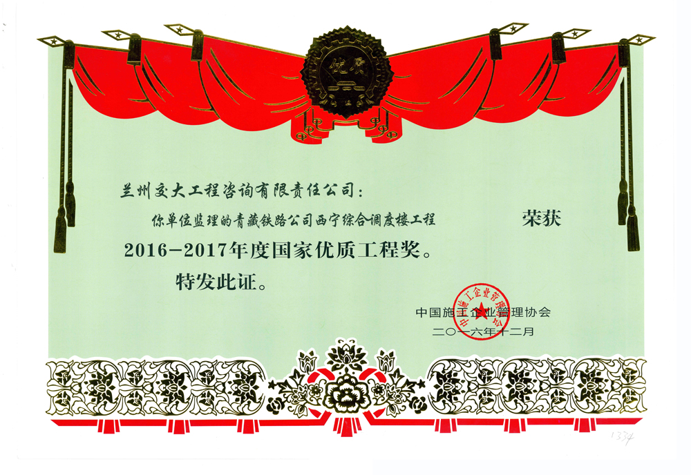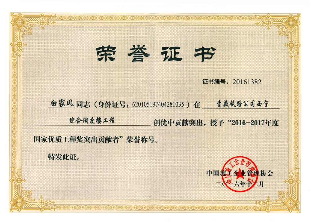 2016年12月,我西寧分公司監理的“青藏鐵路公司西寧綜合調度樓工程”榮獲“2016-2017年度國家優質工程獎”,同時,總監理工程師白家風同志榮獲“2016-2017年度優質工程獎突出貢獻者”榮譽稱號。
