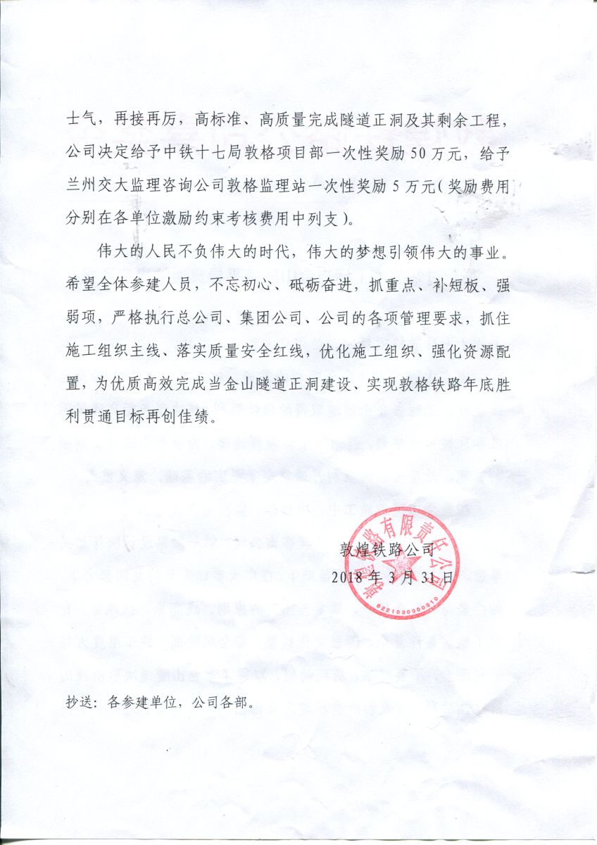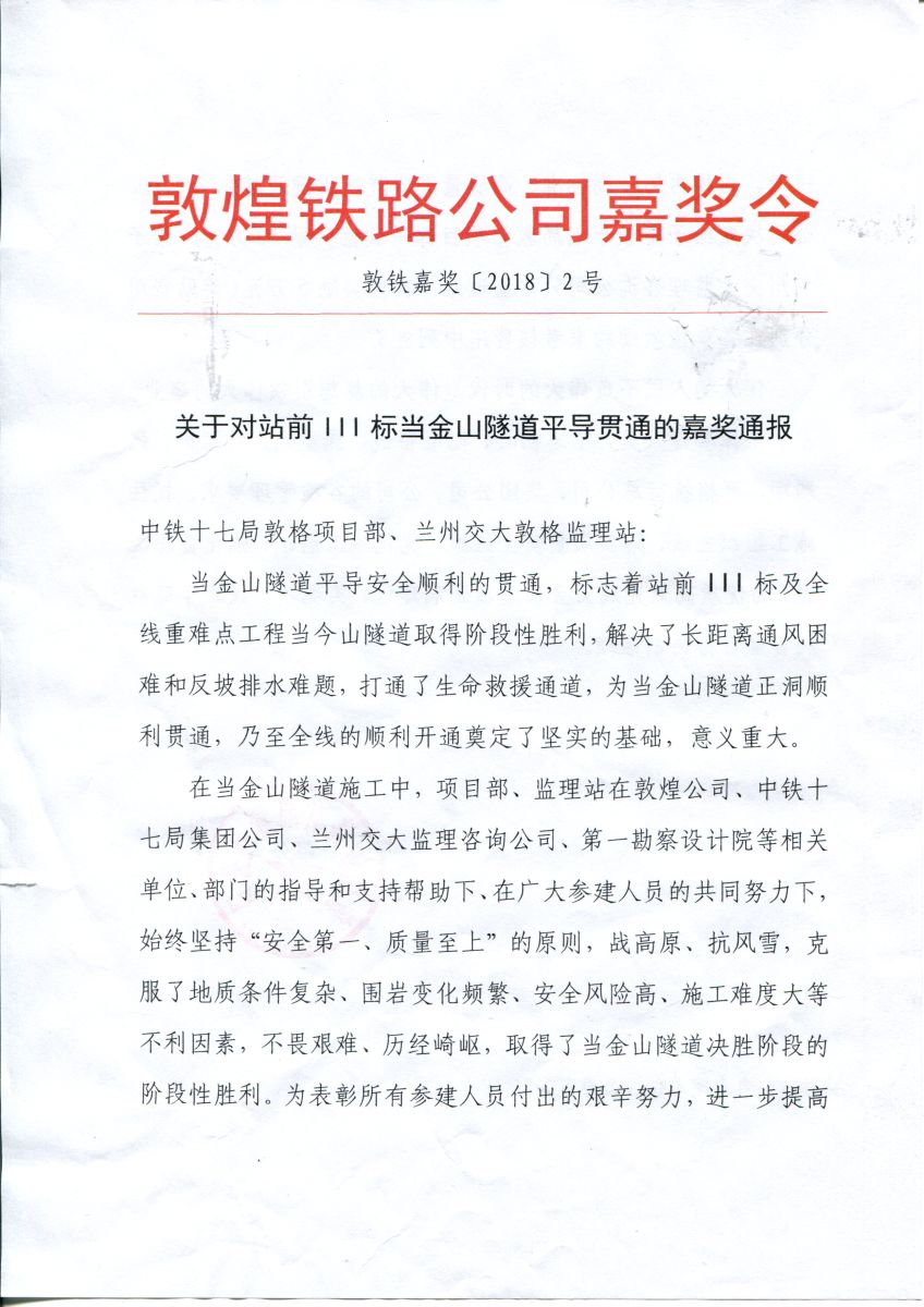 公司董事長(zhǎng)劉鳳奎出席了當(dāng)金山隧道平導(dǎo)貫通儀式,并代表監(jiān)理單位做了表態(tài)發(fā)言。敦煌鐵路公司對(duì)敦格監(jiān)理站的工作給予了充分肯定,為鼓舞士氣,一次性獎(jiǎng)勵(lì)敦格監(jiān)理站五萬元。