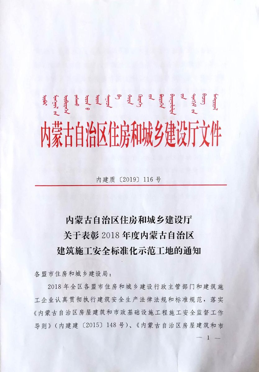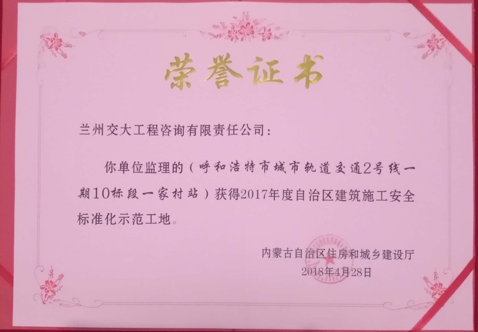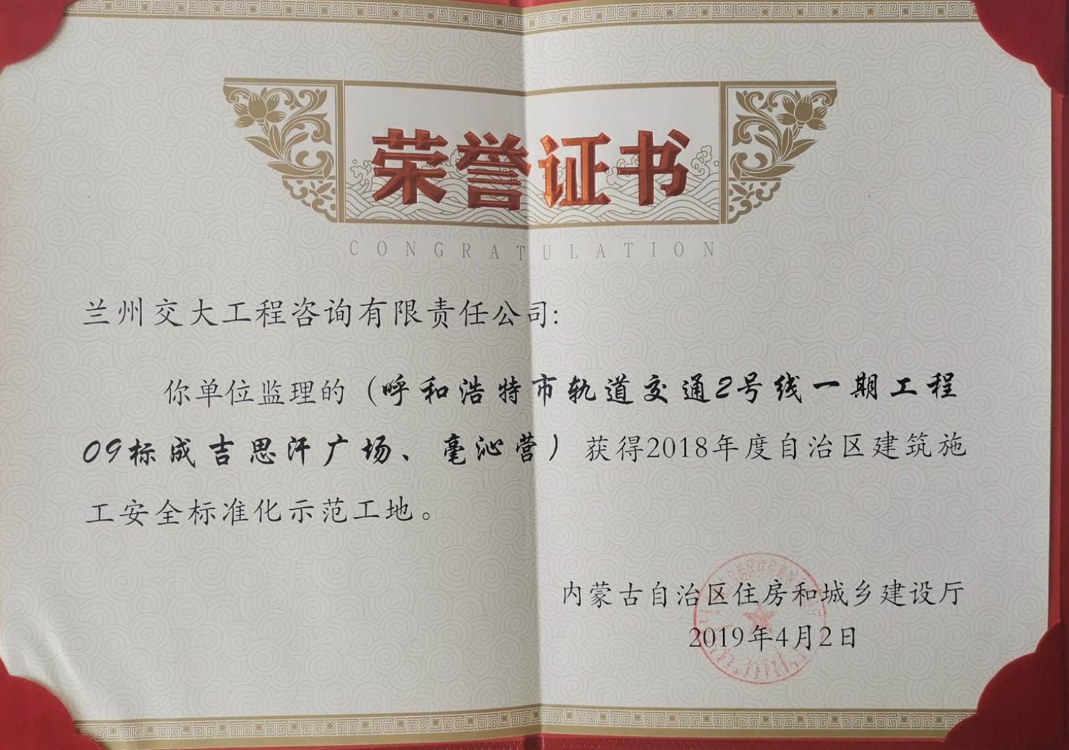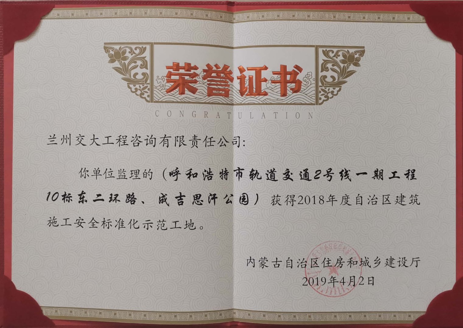 再傳捷報!大同分公司呼市地鐵2號線監理五標獲得內蒙古自治區“2018年度建筑施工安全標準化示范工地”榮譽