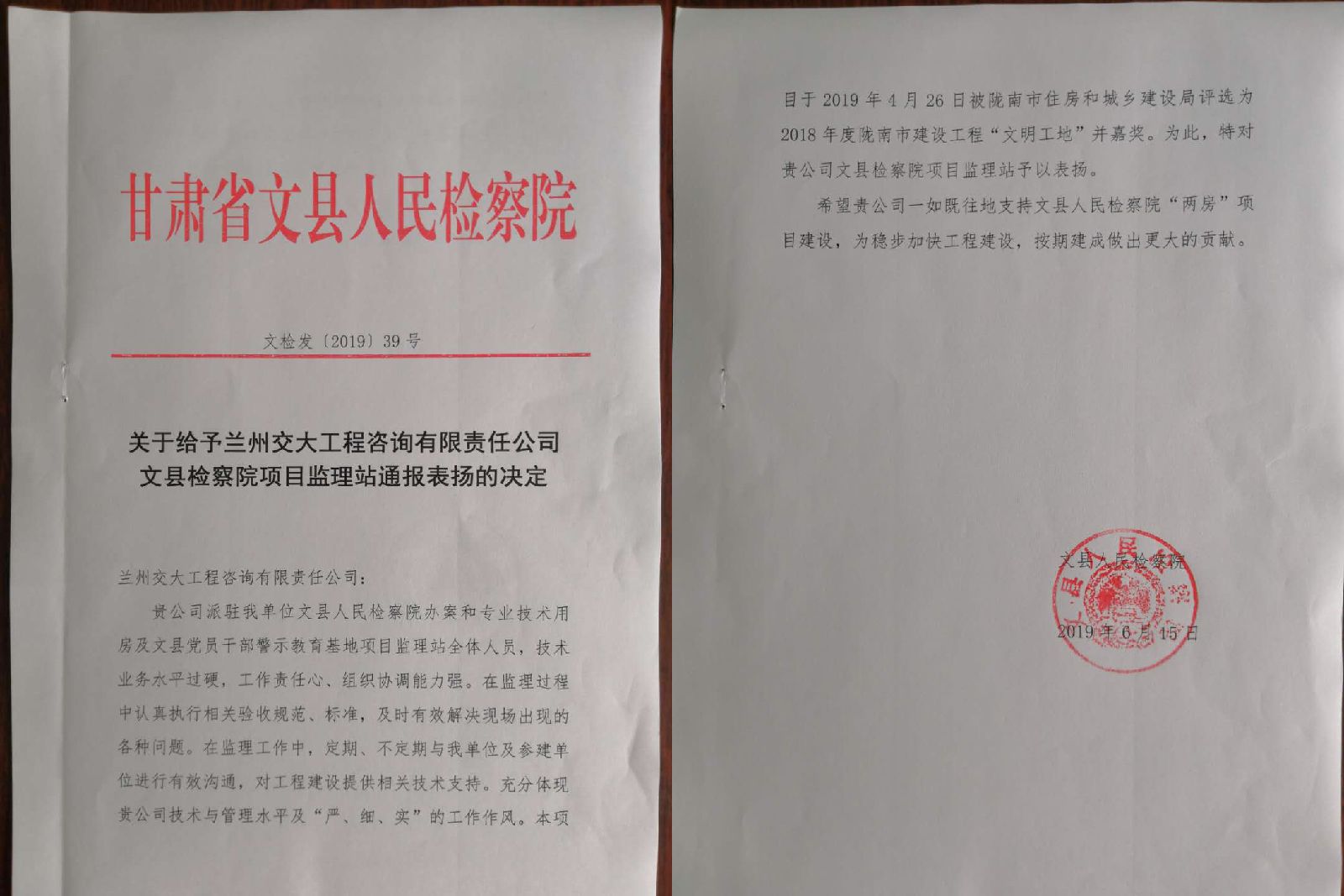 甘肅省文縣人民檢察院下發(fā)《關(guān)于給予蘭州交大工程咨詢有限責任公司文縣檢察院項目監(jiān)理站通報表揚的決定》(文檢發(fā)〔2019〕39號)文件,對文縣監(jiān)理站給予通報表揚。