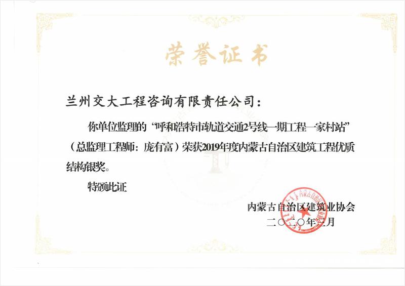 2019年度內蒙古自治區(qū)建筑工程優(yōu)質結構金獎