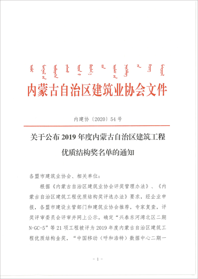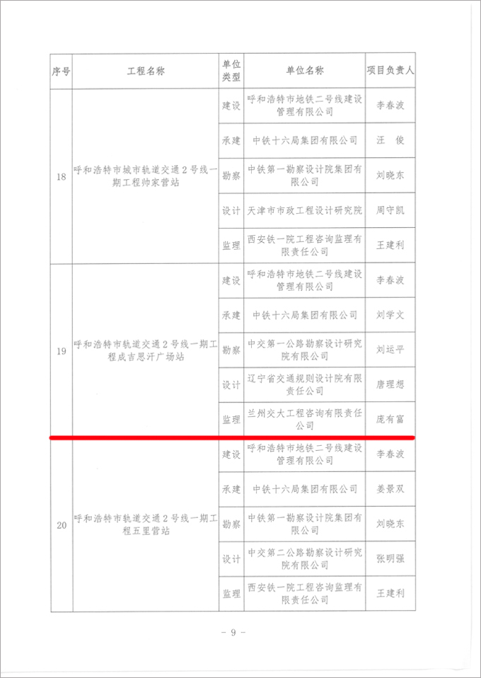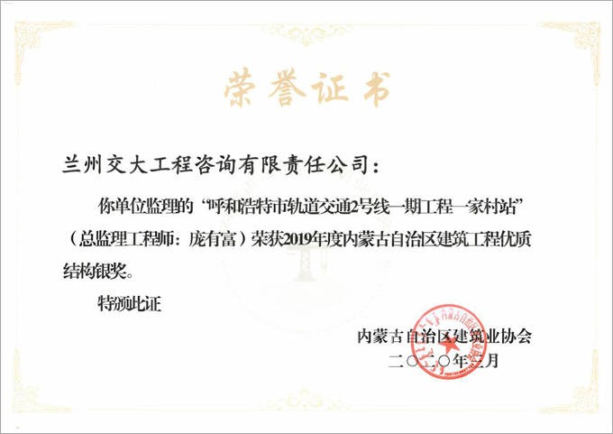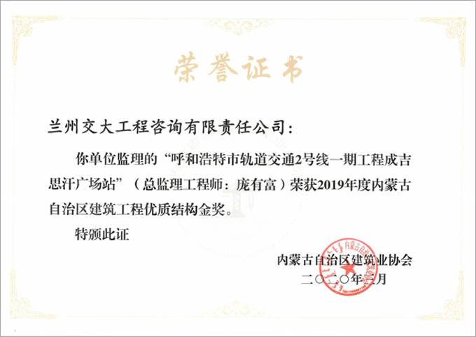 2019年度內蒙古自治區建筑工程優質結構獎評選結果揭曉,由我公司承擔監理的呼和浩特市城市軌道交通2號線一期工程成吉思汗廣場站、一家村站分別獲得內蒙古自治區建筑工程優質結構金獎、銀獎。