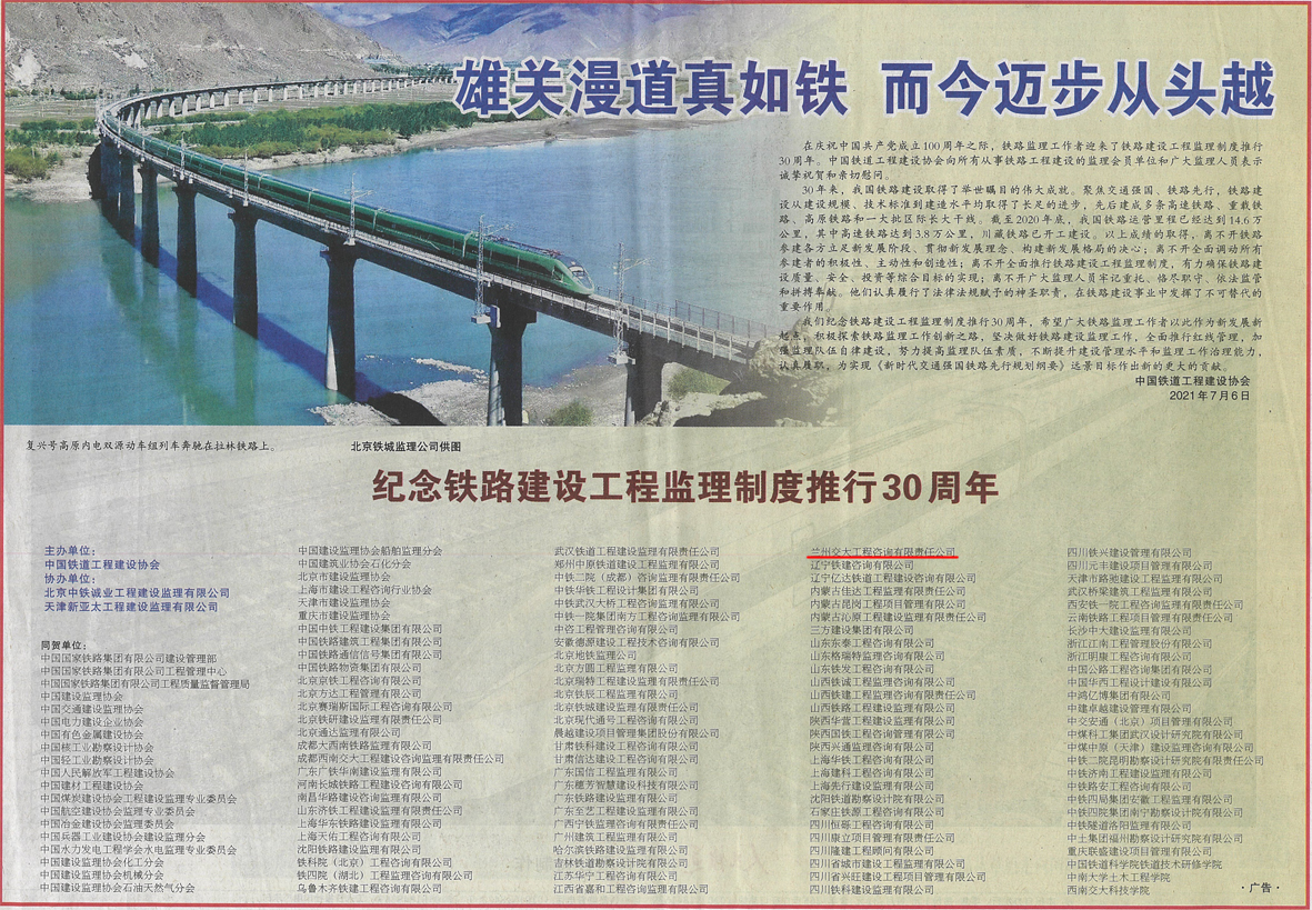 為慶祝會議召開,《人民鐵道》7月6日第三版刊出中國鐵道工程建設協會“紀念鐵路建設工程監理制度推行30周年”賀信。