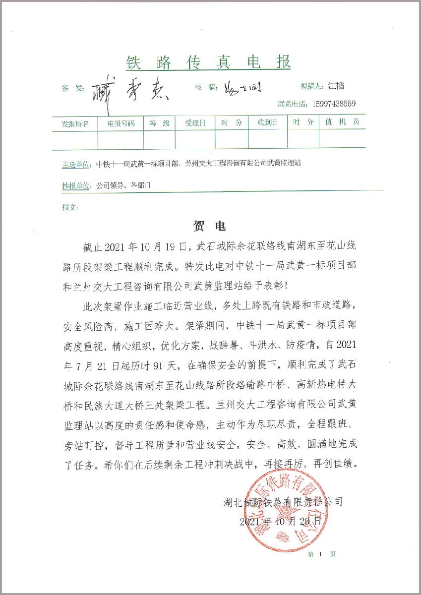 武黃監理站獲業主賀電表彰