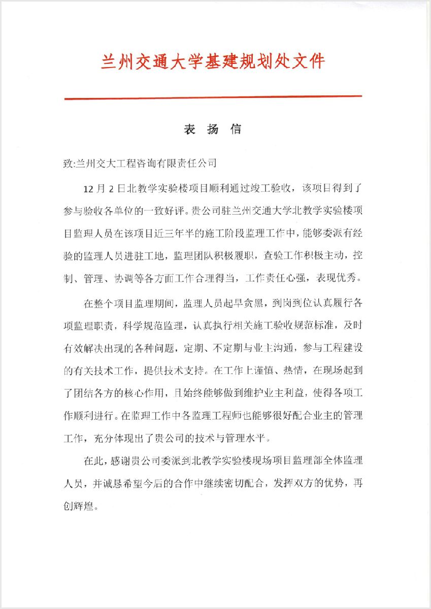 蘭州交通大學(xué)北教學(xué)實驗樓項目監(jiān)理站獲業(yè)主來信表揚
