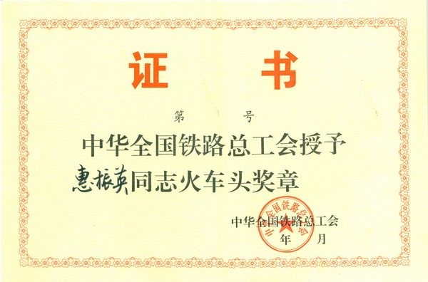 為此中華全國鐵路總工會授予惠振英同志“2012年鐵路客運專線建設火車頭獎章”。公司領導號召全體員工向惠振英同志學習,學習他愛崗敬業、“顧大家、舍小家”的無私奉獻精神;學習他孜孜不倦,努力提高個人業務水平的刻苦精神;學習他身先士卒、甘當排頭兵,勇挑工作重擔的奉獻精神。