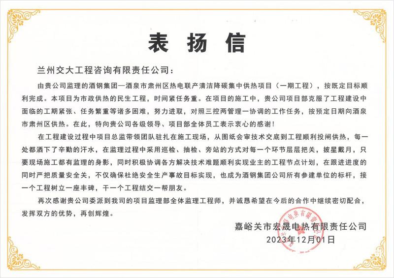 酒鋼集團(tuán)宏晟電熱公司給公司發(fā)來表揚(yáng)信